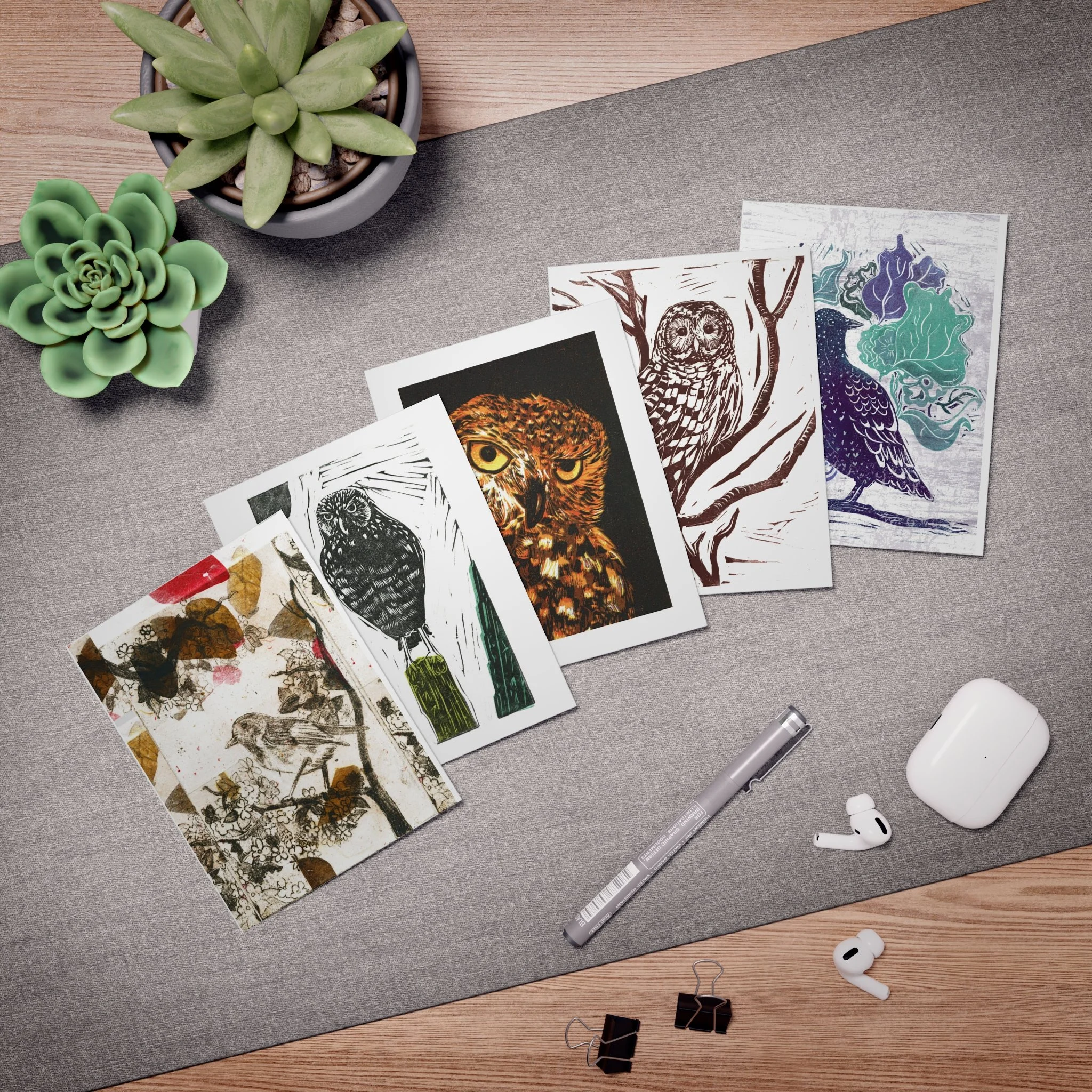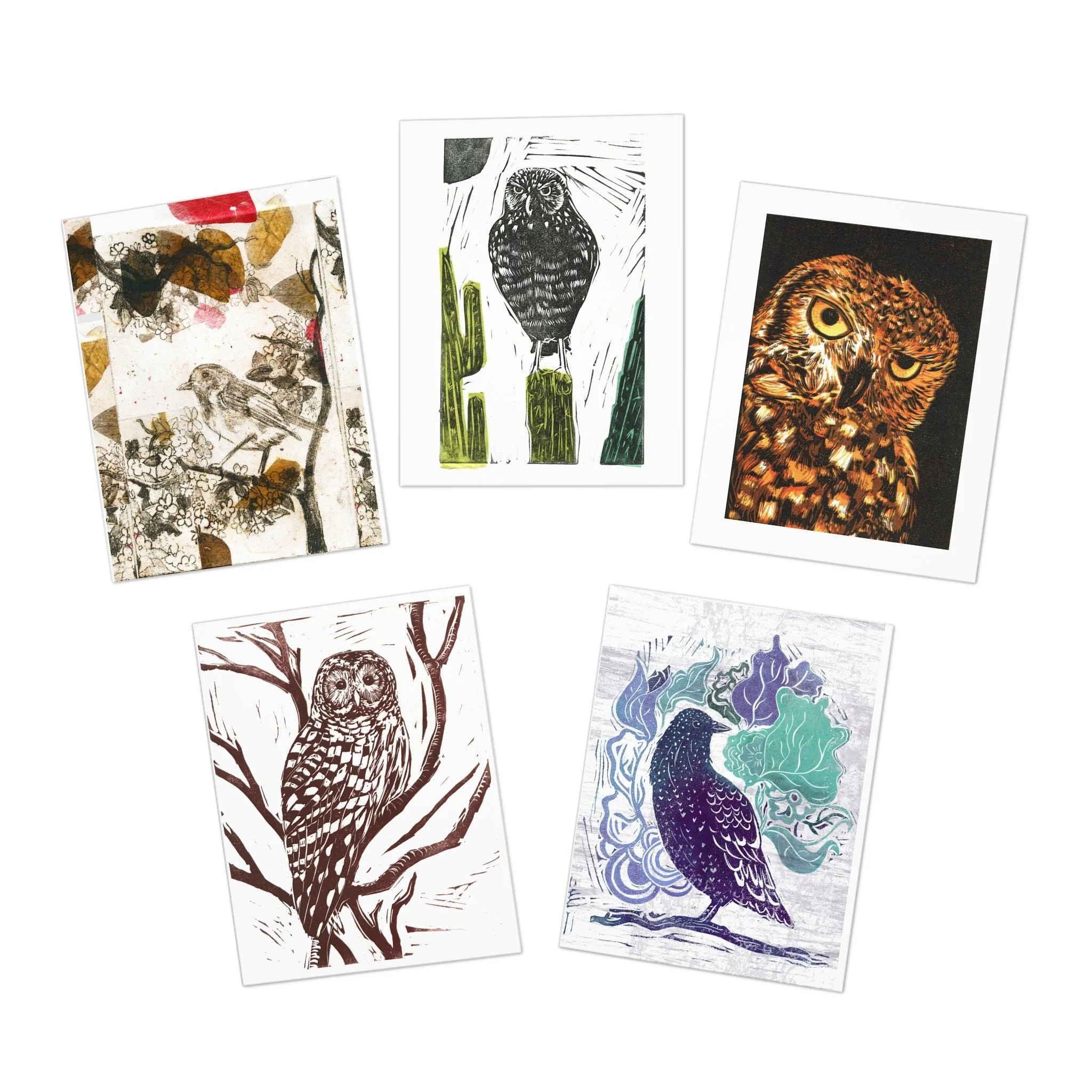 5 Pack of note cards, with each one depicting a different bird. The set features 3 different owls, 1 starling bird illustration and a small tanager. These designs are reproductions of original linocut illustrations that I created. They come in 4.25" by 5.5" with matching envelopes. Each card is made with high-quality uncoated paper and are blank on the inside.